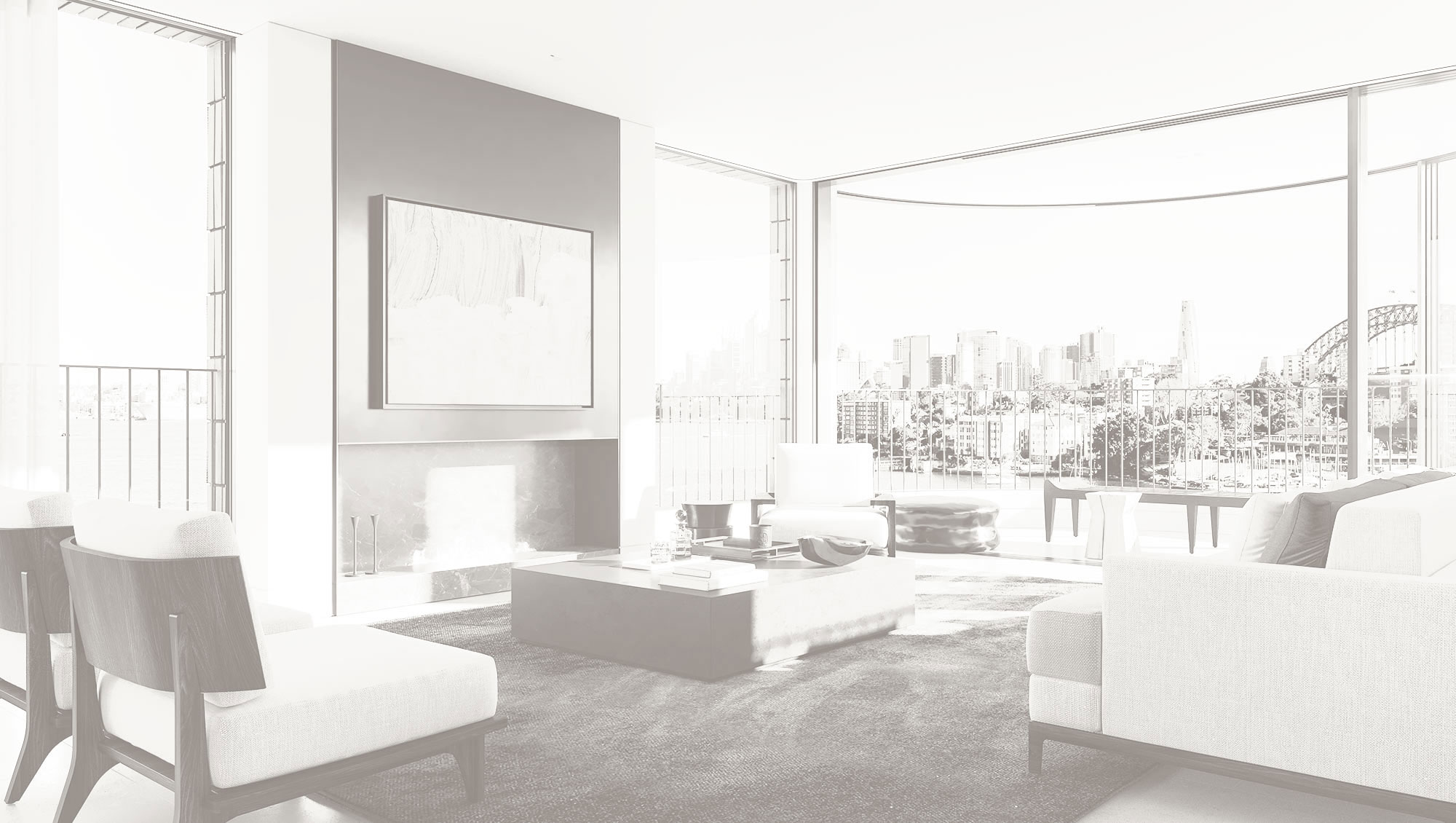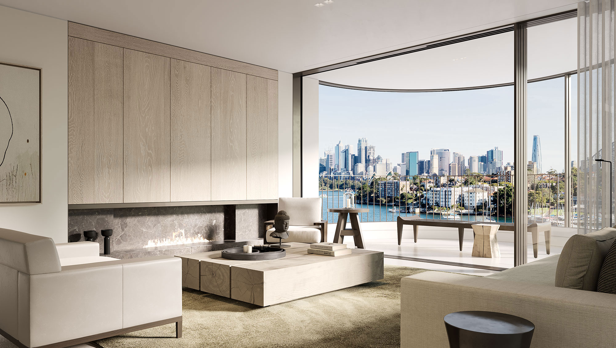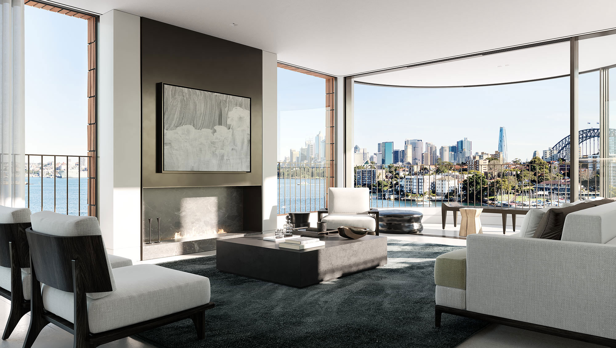 A sea of limestone flows beneath your feet; burnished metal accents reflect the shimmering light cast from the water; and strong design elements emphasise the statement Sydney backdrop.