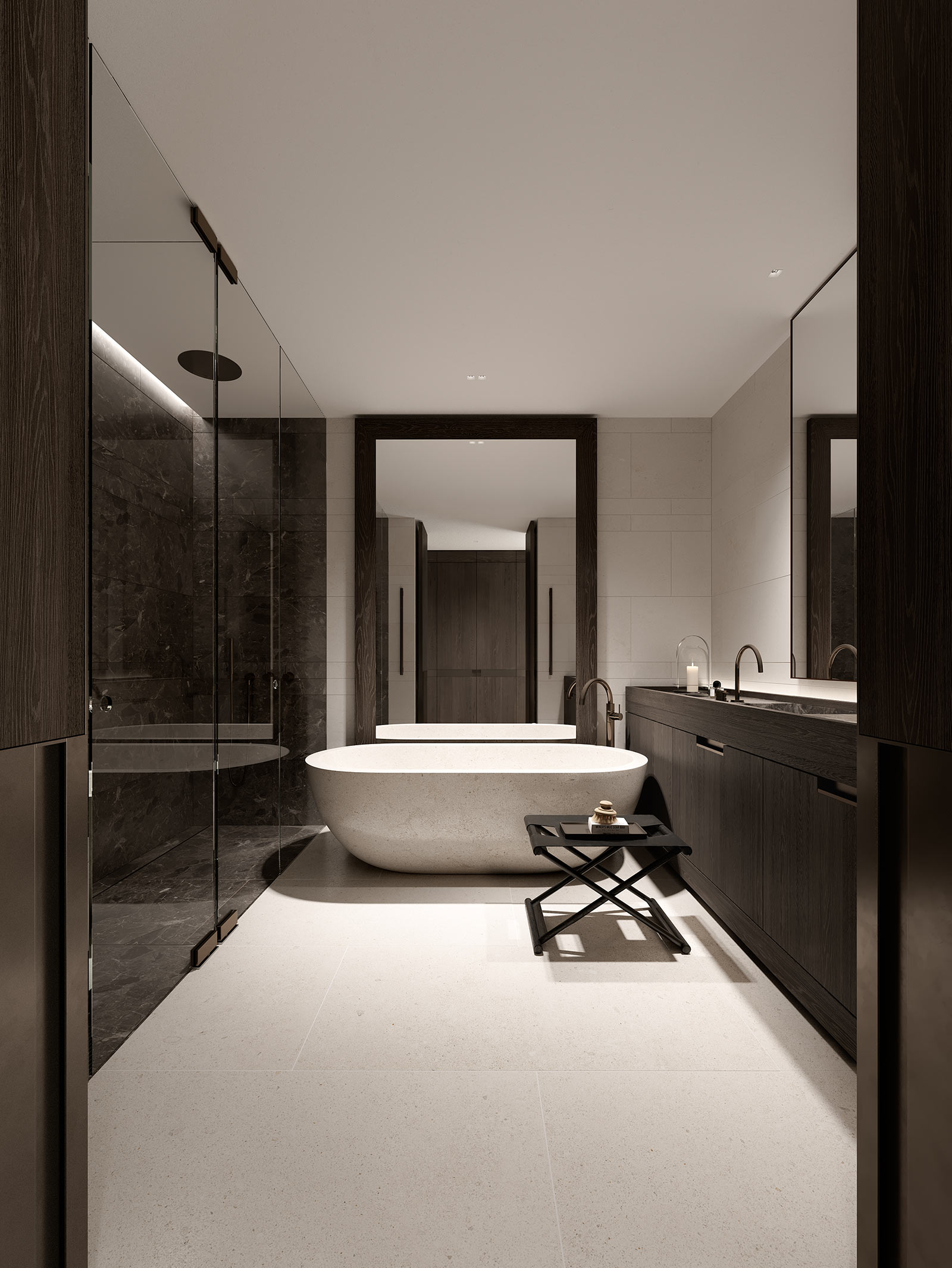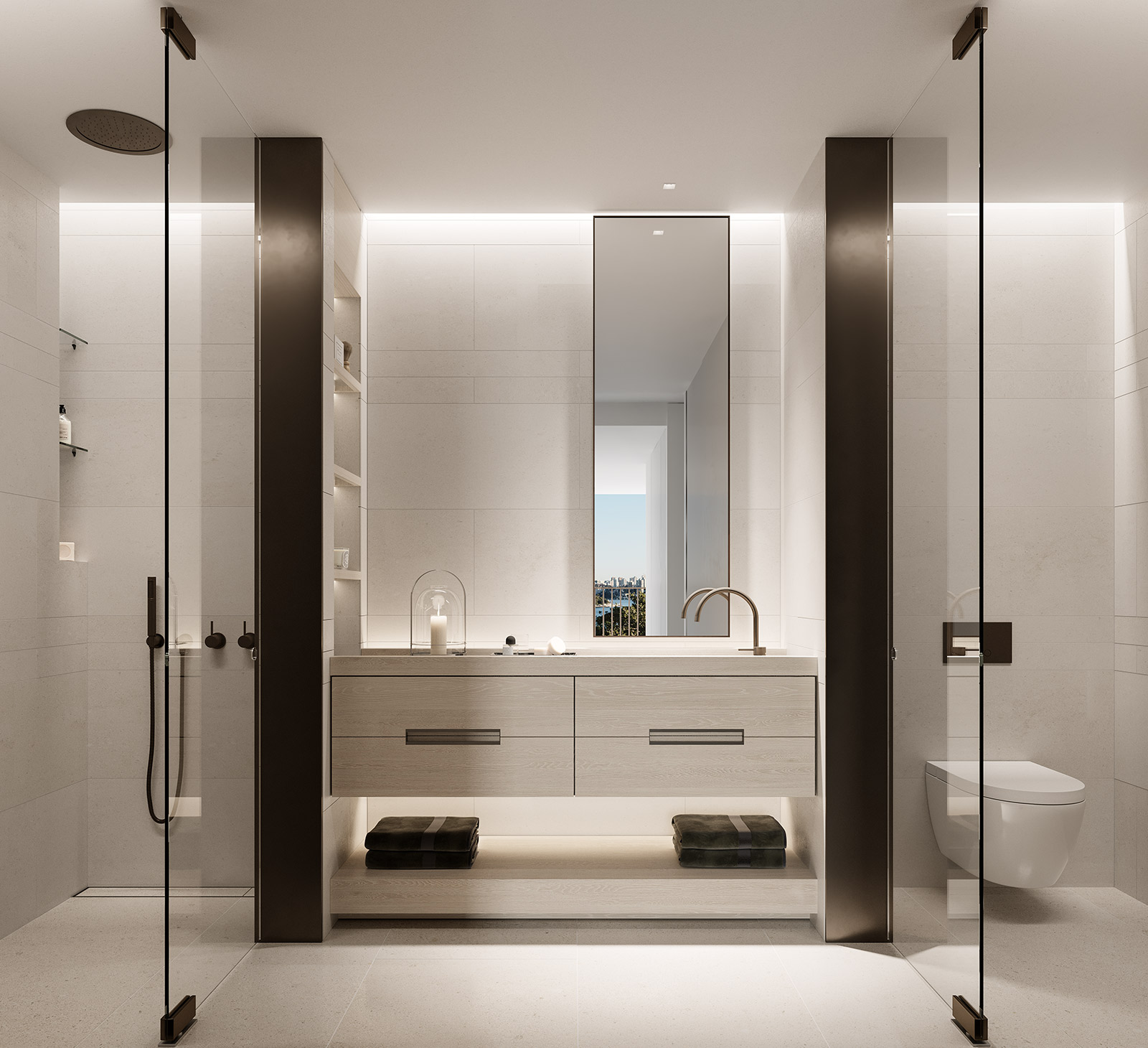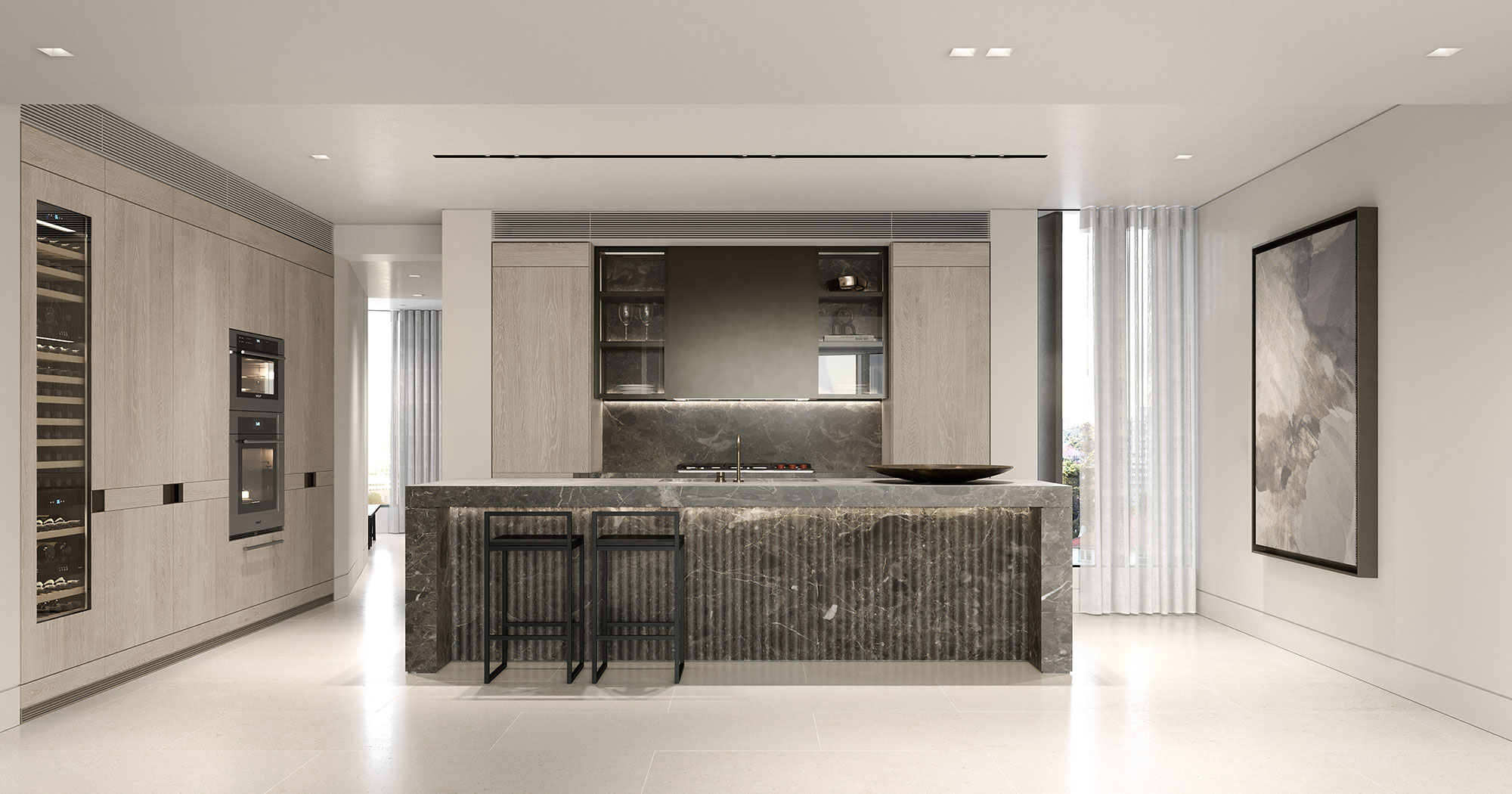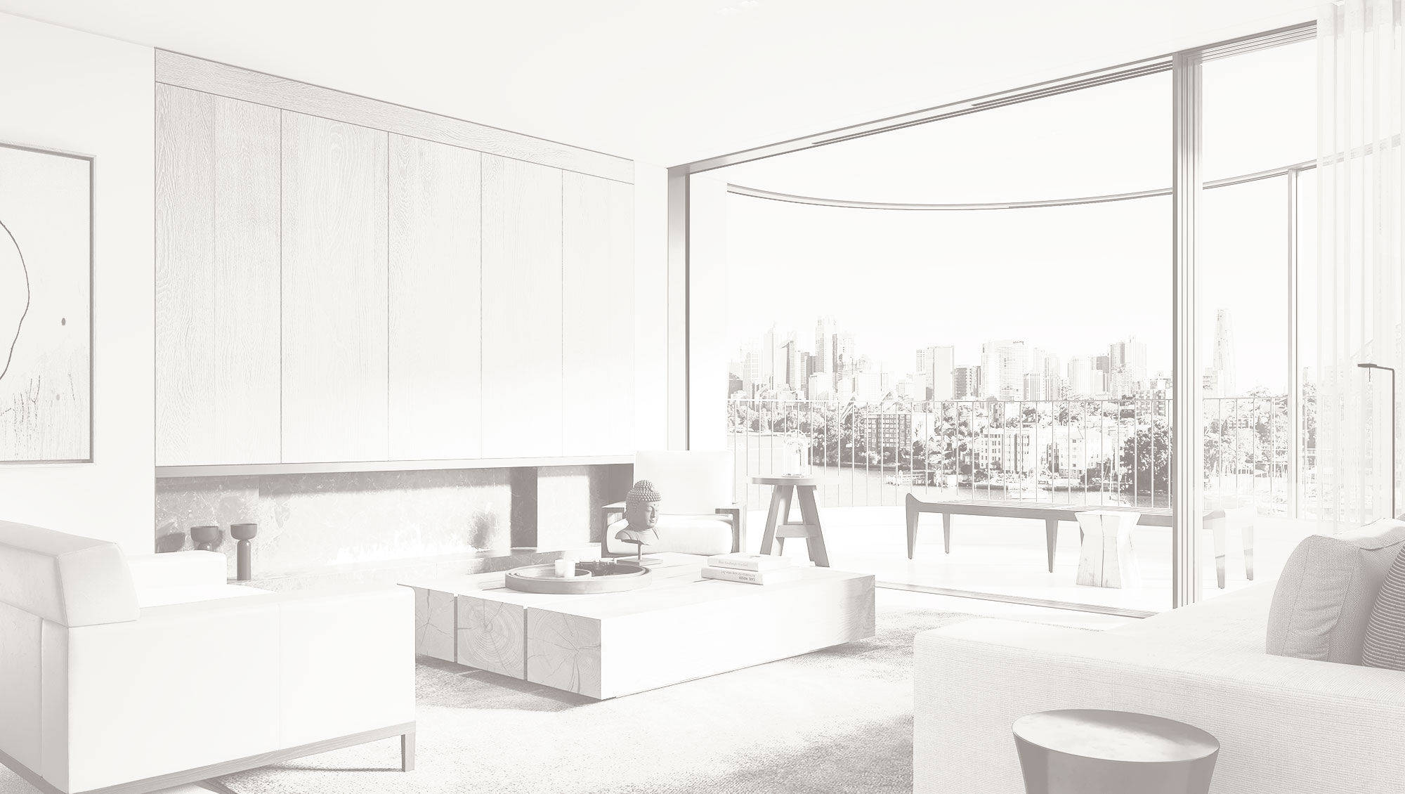 A sea of limestone flows beneath your feet; burnished metal accents reflect the shimmering light cast from the water; and strong design elements emphasise the statement Sydney backdrop.