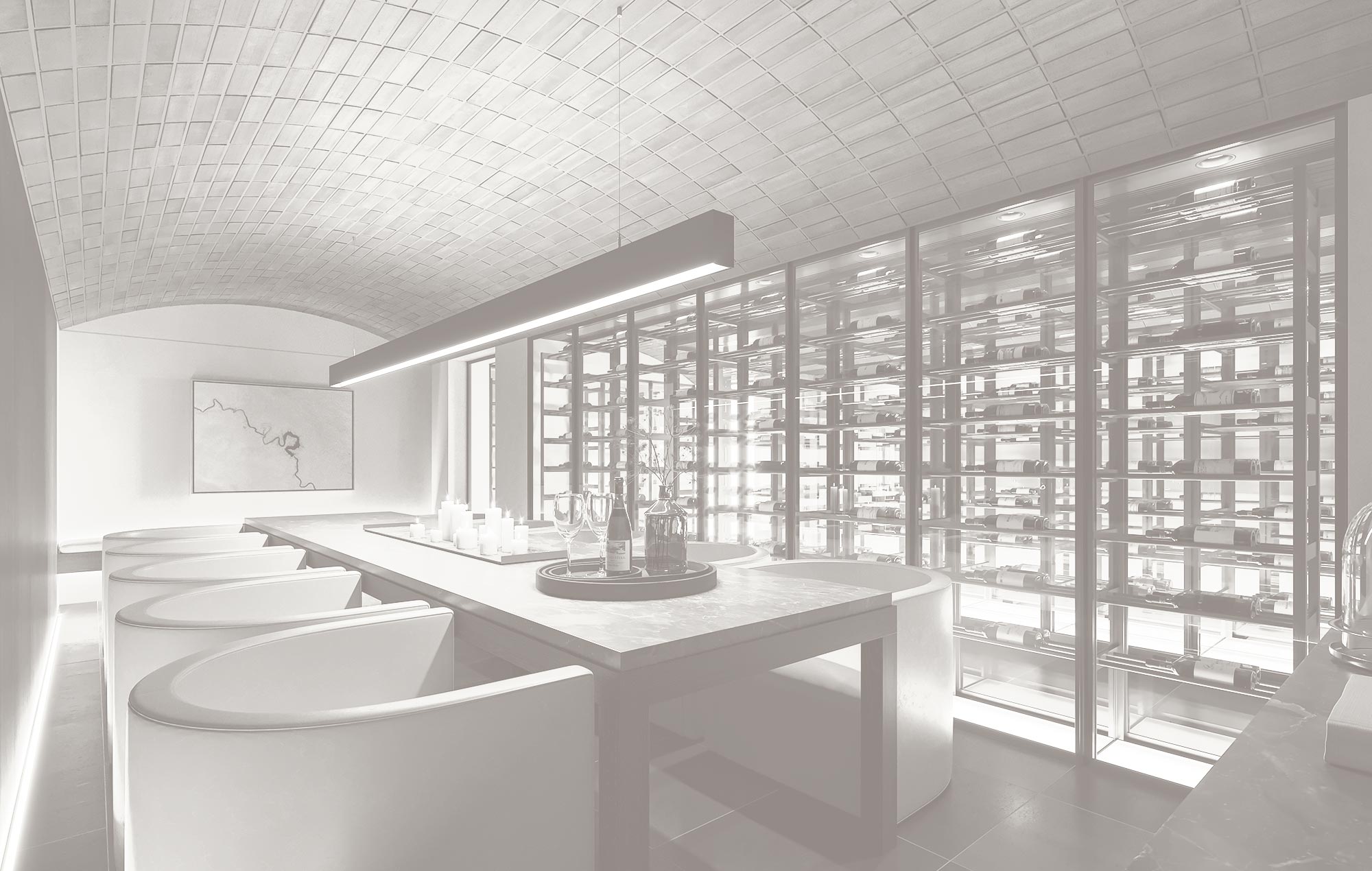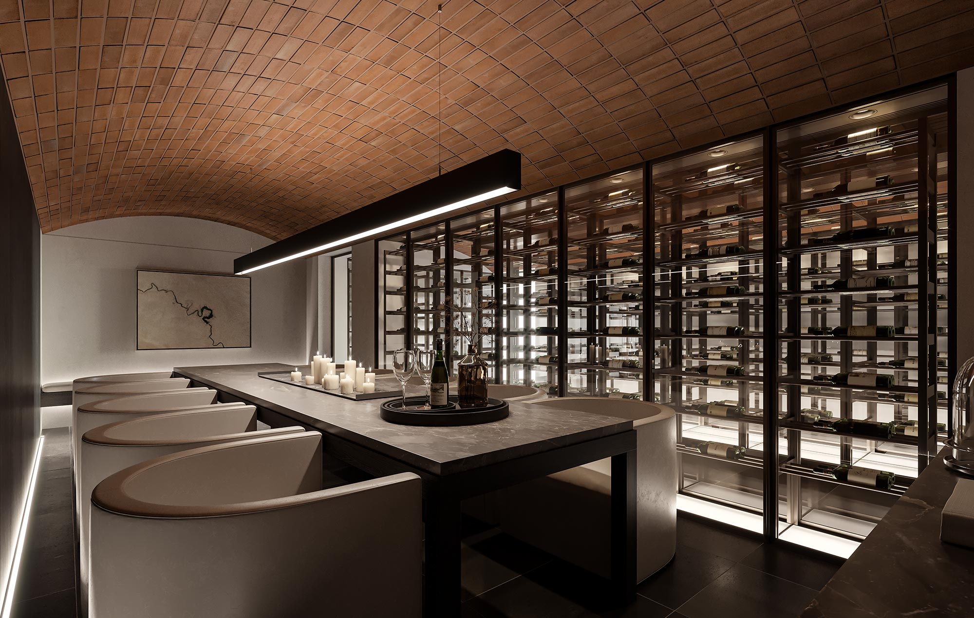 A stunning cellar room provides space for the most extravagant of wine collecting connoisseurs and an elegantly furnished setting away from your residence for more intimate conversation or retreat.